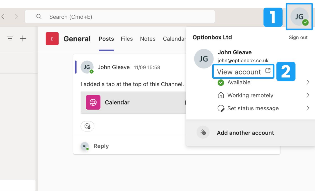 In Microsoft Teams, click your profile image in the top right. (1)