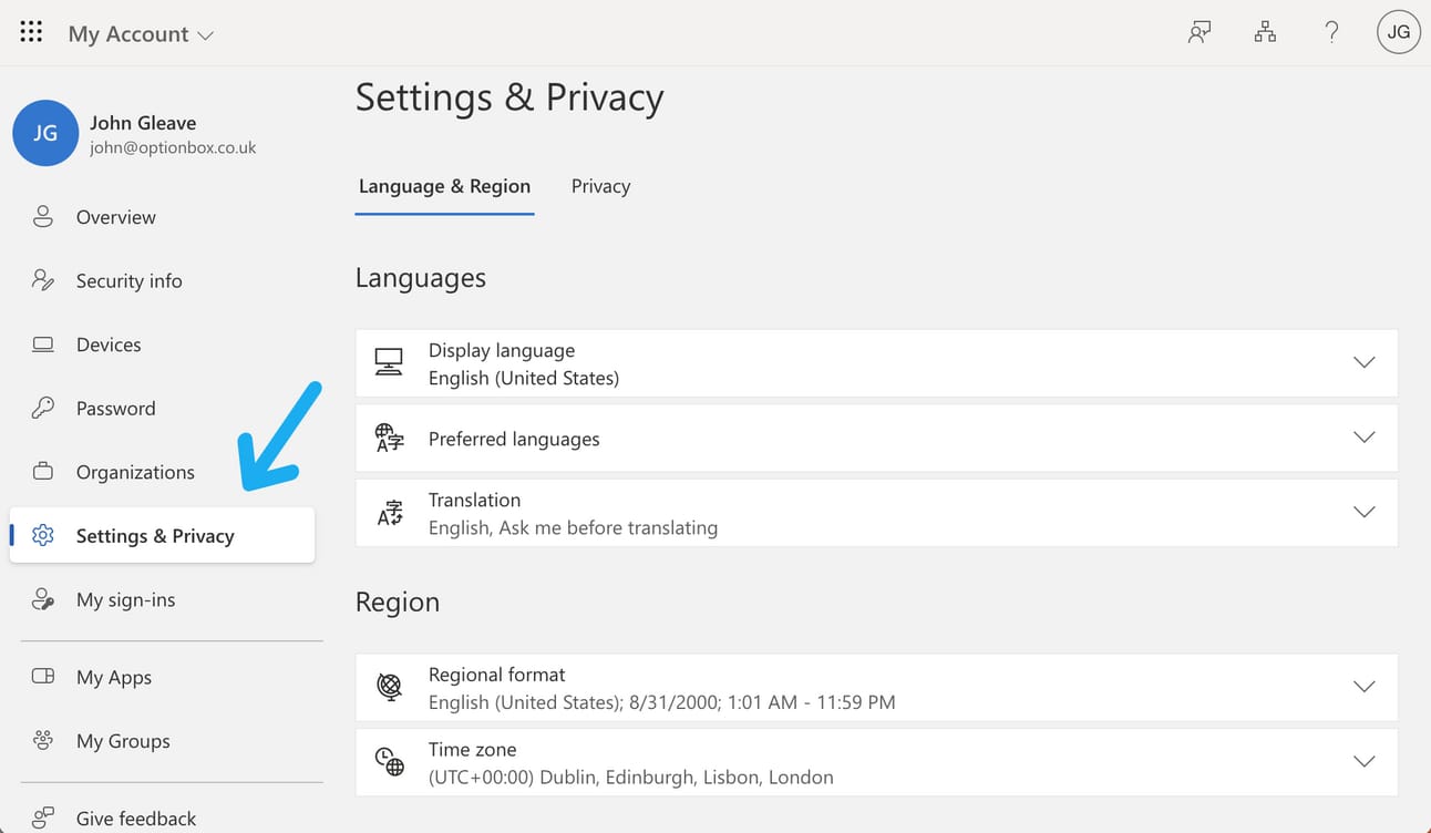 Change the TimeZone in Your Microsoft Account Page