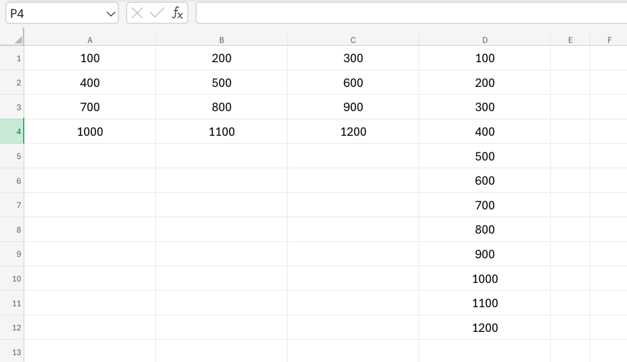 =TOCOL(A1:C4)into cell D1 and Excel transformed the range into a single column.