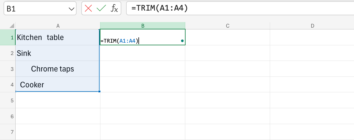 To trim the spaces from cells A1 to C4, enter =TRIM(A1:A4) into an empty cell and hit Enter.