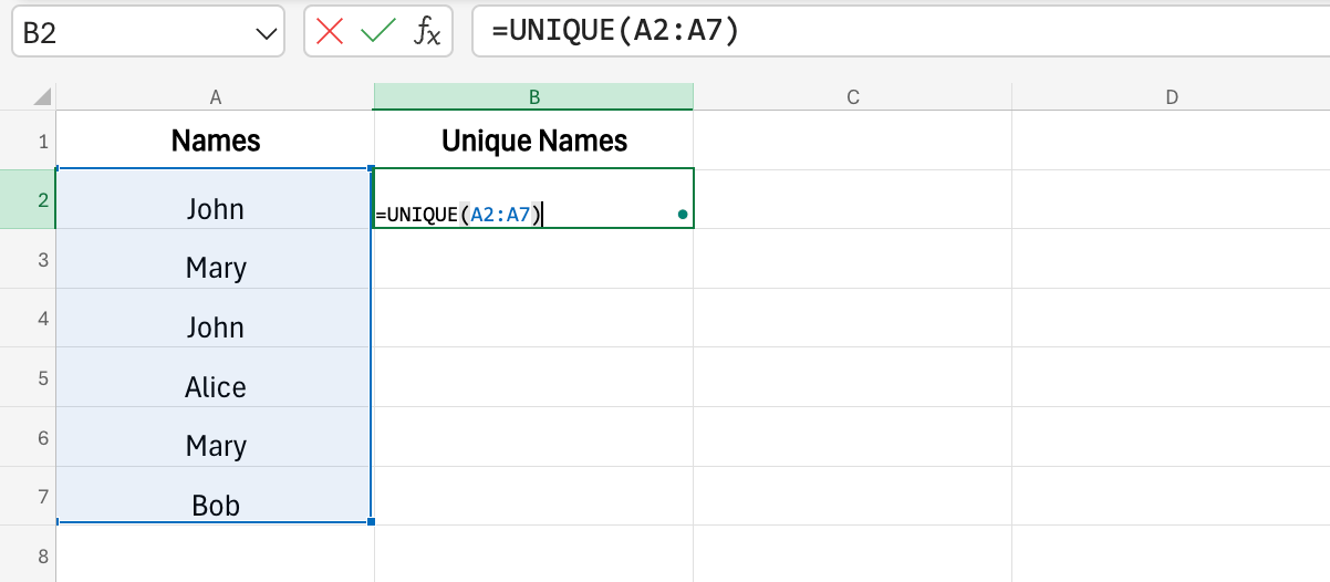 To get a list of unique names from cells A2 to A7, enter the following formula into an empty cell and hit Enter: