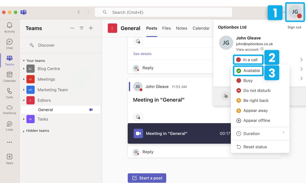 Select your current availability, which should be “In a call.” (2)