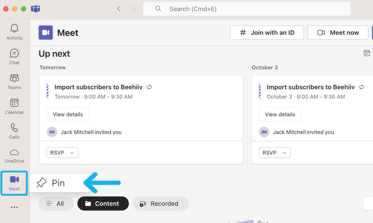 You can also add the Meet app by searching for it in the Teams app bar and pinning it for quick access.